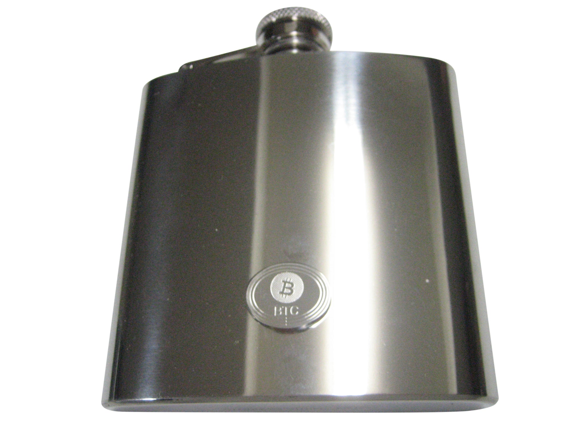 Silver Toned Oval Etched Bitcoin Coin Cryptocurrency Blockchain 6oz Flask
